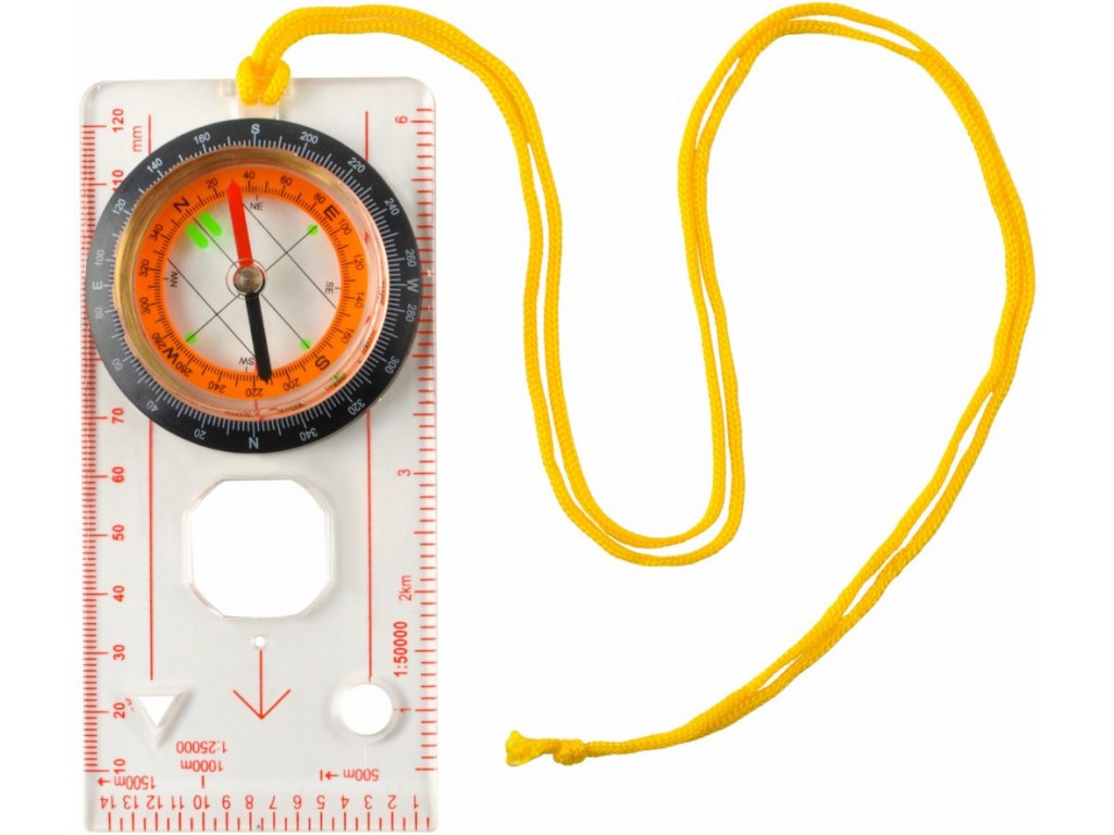 Otáčí se o 360 °. V nádobě s tekutinou jsou dvoubarevné magnetické jehly, které poskytují přesné čtení. To oceníte vždy, když potřebujete určit směr jak při chůzi tak třeba při běhu. Jehly a disk se dají číst i v případě nedostatku světla, protože jsou označeny fluoresenční barvou. Součástí kompasu je i lupa, která Vám umožní důkladné čtení. Šablony navíc umožňují kreslit na mapě a to pomocí díry ve tvaru kruhu nebo trojúhelníku. Na kompasu je zavěšena šňůra a to tak, že struna nevychyluje kompas.